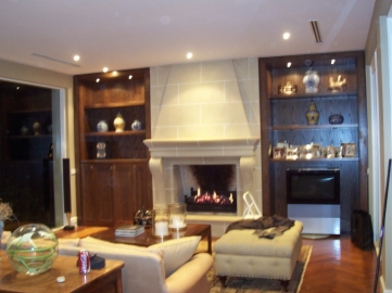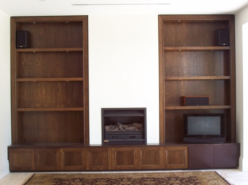 Painted 2pac TV unit with floating shelves above. Top and infills in Tas Oak 50% clear lacquered